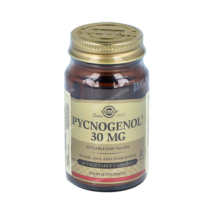 Composicion: Por 1 cápsula: Extracto pulverizado de corteza de pino marítimo francés (Pinus pinaster) Pycnogenol)........30 mg Diluyente: celulosa microcristalina; cubierta de la cápsula vegetal: hidroxipropilmetilcelulosa; antiaglomerantes: ácido esteárico vegetal, estearato de magnesio vegetal.