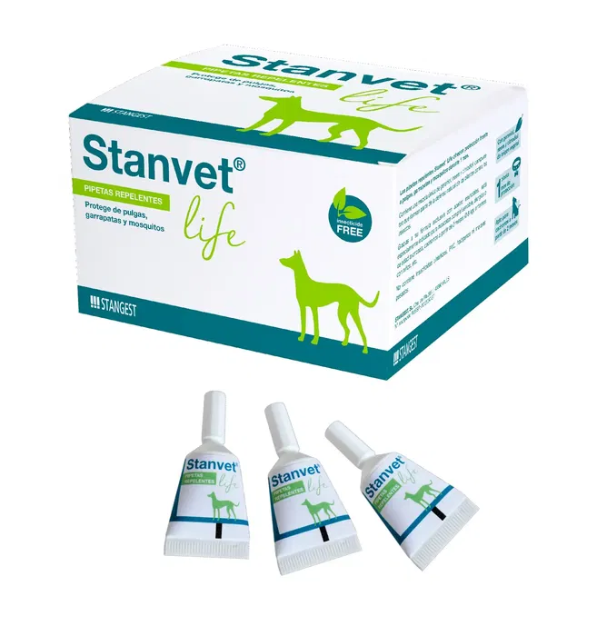 Pipetas antiparasitarias Stanvet Life en práctico expositor de 12 unidades. Marca: Stangest. Ideal para la protección regular de tu mascota contra pulgas y garrapatas.