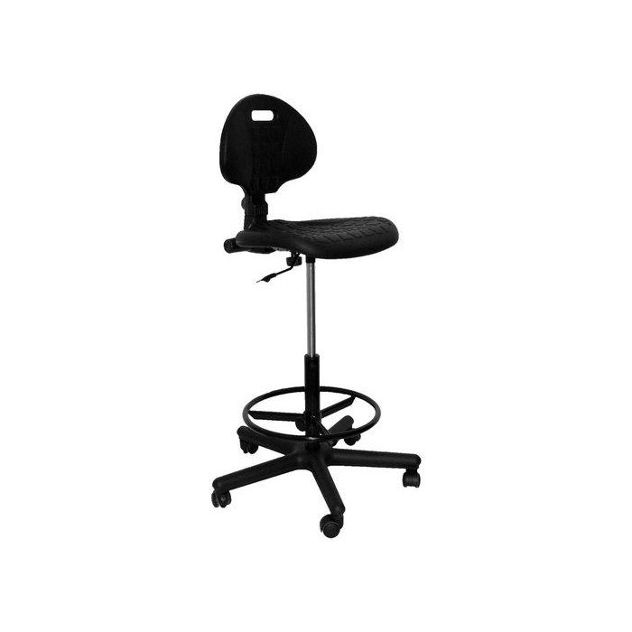 Taburete de trabajo ergonómico, giratorio y regulable en altura, con asiento y respaldo de poliuretano inyectado de alta resistencia. Taburete de trabajo especial para talleres u oficios donde hay que pasar la mayor parte del tiempo trabajando de pie o sentado. El poliuretano inyectado lo hace resistente al uso, elemento clave para este tipo de trabajos. Su mejor característica es el aro reposapiés metálico, para un mejor apoyo de los pies.