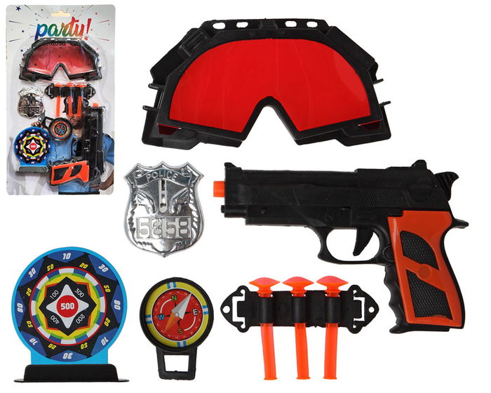 Vive intensas aventuras con este completo set lanzadardos. incluye pistola negra y naranja con tres dardos, gafas protectoras rojas, una insignia policial metálica, brújula funcional y diana para mejorar tu puntería. perfecto para fiestas, disfraces de policía o actividades al aire libre, garantiza horas de entretenimiento lleno de acción.