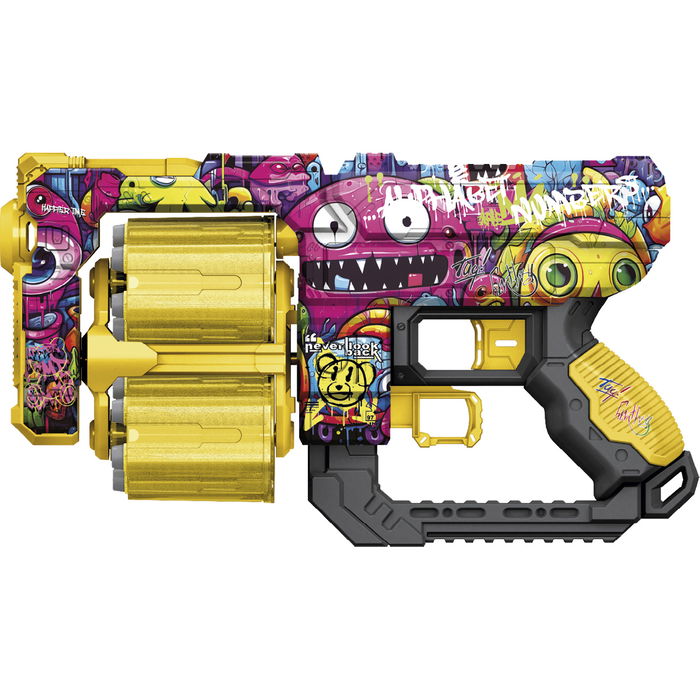 Prepárate para la acción con este blaster de tamaño medio, diseñado con un estilo grafitero moderno y lleno de color. Equipado con un cargador automático de 6 dardos, permite recargas rápidas y disparos consecutivos para no perder ritmo en la batalla. El set incluye 12 dardos de espuma: 6 listos para disparar y 6 de repuesto. Su estructura ergonómica lo hace cómodo de manejar, ideal para niños que buscan estilo, precisión y diversión en cada partida.Dimensiones 6X32X18cm