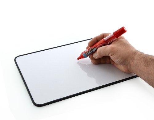 Pizarra blanca con bordes plásticos en PVC (no tóxico). Medidas: 210 x 297 mm.