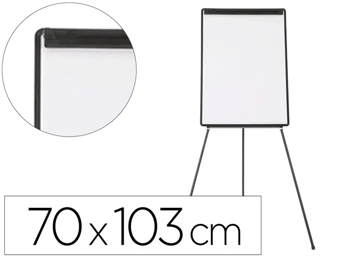 Pizarra trípode con marco y bandeja en plástico negro. Superficie laminada (MDF) pintada en color blanco, apta para la escritura con rotuladores de borrado en seco. También apta para todo tipo de blocs de papel gracias a su pinza superior. Pies telescópicos con altura regulable hasta 200 cm. Con bandeja inferior para rotuladores y útiles. Medidas del tablero: 70 x 100 cm.