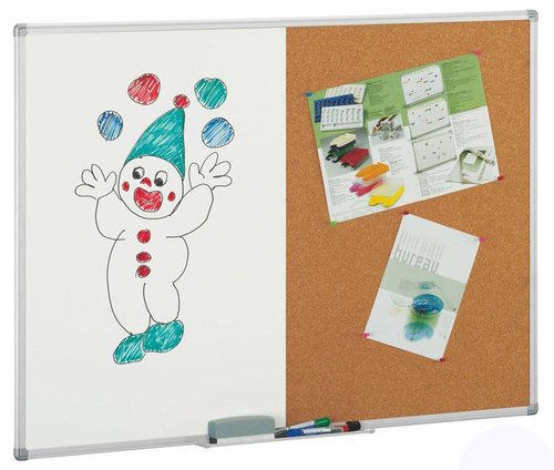 Pizarra de doble uso con marco de aluminio y cantoneras decorativas. La mitad de su superficie es de corcho, y la otra mitad es pizarra blanca. Suministrada con cajetín de aluminio de 40 cm y elementos de fijación.