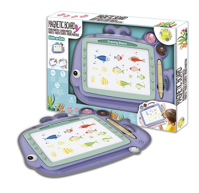 Pizarra magnética a todo color con forma de pez de color azul. Incluye piezas con formas para estampar lapicero y láminas para dibujar. Borrado automático.