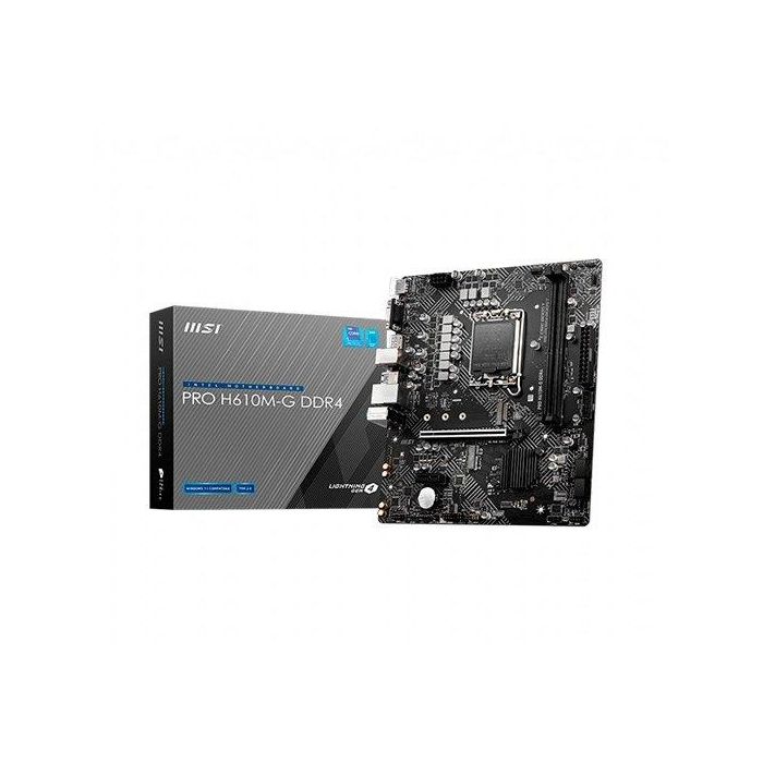 Compra la MSI Pro H610M-G DDR4 al mejor precio en Neobyte y equipa tu PC workstation con una placa base de garantÃas. Este modelo con formato micro-ATX se adaptará a todo tipo de configuraciones gracias a sus reducidas dimensiones, sin renunciar a una completa conectividad y a una fabricación de calidad que segura un uso duradero. Es compatible con memorias RAM DDR4 y procesadores Intel Core de 12ª generación, asà como con sistemas de almacenamiento de alto rendimiento. Apuesta por la MSI Pro H610M-G DDR4.