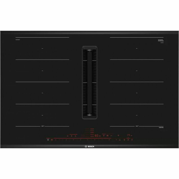 Bosch Serie 8 PXX875D67E. Color del producto: Negro, Tipo de instalación: Integrado, Anchura de los quemadores: 80 cm. Zona de cocción a fuego lento: 2200 W, Zona de cocción media: 3300 W. Tipo de control: Tocar, Control de posición: Frente, Tipo de reloj: Electrónico. Tipo de extracción: Recirculación, Máxima capacidad de extracción: 500 m³/h, Nivel de ruido: 69 dB. Carga conectada (eléctrica): 7400 W, Voltaje de entrada AC: 220-240 V, Frecuencia de entrada AC: 50-60 Hz