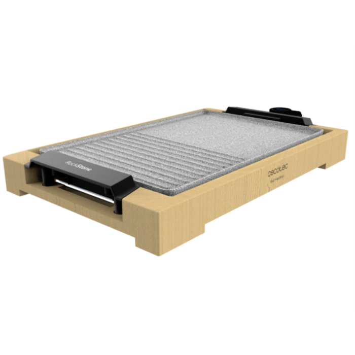 Cecotec 03091 Plancha Eléctrica y Grill, 2000 W, Placa RockStone Antiadherente Extraíble, Termostato Ajustable, Estructura Bambú, 37.5x24.5 cm, Color Gris y Madera
