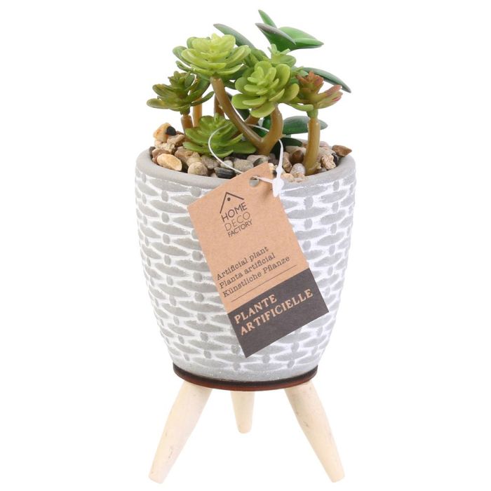 - Trae un poco de decoración verde a tu hogar con esta planta artificial presentada en una maceta de cemento con patas de madera.