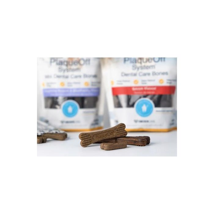 - La gama de productos PlaqueOff® para la higiene bucodental de perros y gatos, son complementos alimenticios 100% naturales, únicos en su composición y con patente internacional. Su uso continuo combate la placa, el sarro y el mal aliento de forma eficaz. Utilizar PlaqueOff® Polvo diariamente ayuda a mantener la salud de dientes y encías. La acumulación de sarro puede provocar enfermedades bucales y sistémicas, como gingivitis, enfermedad periodontal, endocarditis bacteriana e incluso problemas de pulmón, hígado o riñón. Toda la gama PlaqueOff® actúa a nivel sistémico previniendo el depósito de la placa y el sarro y facilitando el desprendimiento del existente. Al cabo de pocas semanas el mal aliento desaparece y los signos de mejoría empiezan a hacerse evidentes