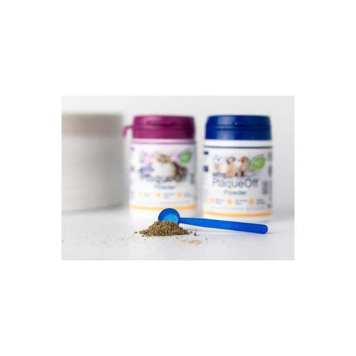 - La gama de productos PlaqueOff® para la higiene bucodental de perros y gatos, son complementos alimenticios 100% naturales, únicos en su composición y con patente internacional. Su uso continuo combate la placa, el sarro y el mal aliento de forma eficaz. Utilizar PlaqueOff® Polvo diariamente ayuda a mantener la salud de dientes y encías. La acumulación de sarro puede provocar enfermedades bucales y sistémicas, como gingivitis, enfermedad periodontal, endocarditis bacteriana e incluso problemas de pulmón, hígado o riñón. Toda la gama PlaqueOff® actúa a nivel sistémico previniendo el depósito de la placa y el sarro y facilitando el desprendimiento del existente. Al cabo de pocas semanas el mal aliento desaparece y los signos de mejoría empiezan a hacerse evidentes.