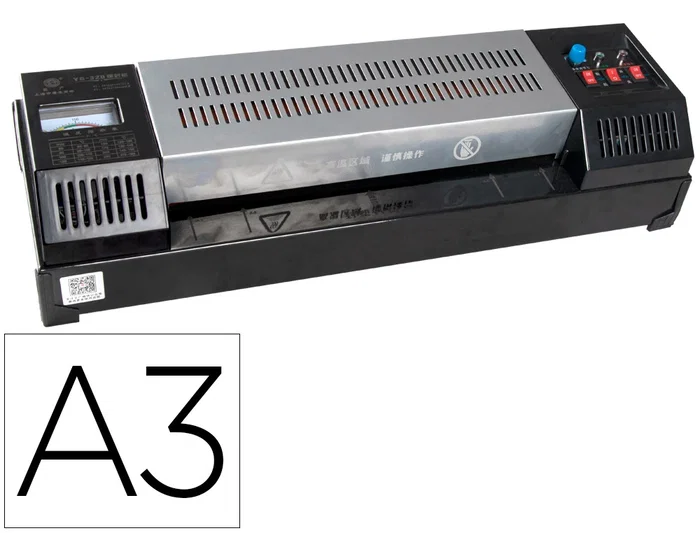 Plastificadora de uso profesional. 4 rodillos. Marcha hacia delante y hacia atrás. Interruptor de encendido y motor independientes. Funcionamiento en caliente, con regulador de temperatura de 75 a 200 ºC. Espesor máximo <= 1 mm. Adecuada para plastificar papel DIN A4 y DIN A3. Utiliza fundas desde 100 hasta 200 micras. Tiempo de calentamiento 2-3 minutos. Medidas: 535 x 195 x 115 mm.