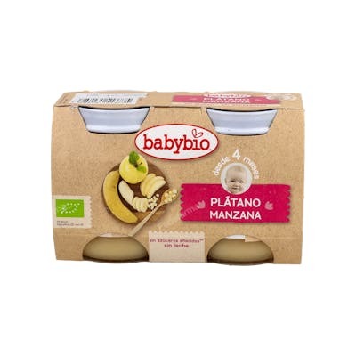 Potito de manzana y plátano para bebes a partir de 4 meses. Babybio selecciona cuidadosamente sus ingredientes, 100% procedentes de agricultura ecológica.