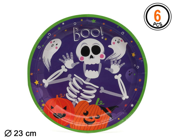 Platos de Cartón Halloween 23 cm con Diseño Susto y Esqueleto – 6 Unidades