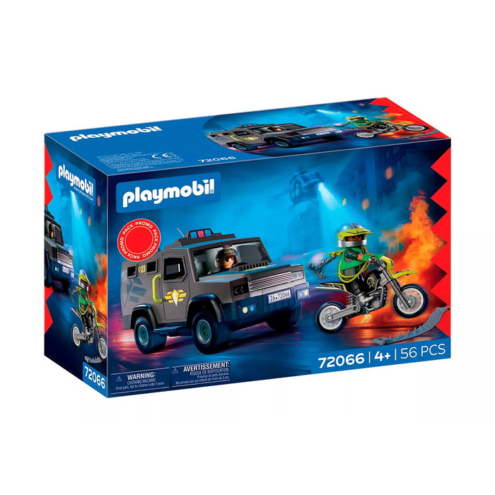 Las luces parpadean y los motores rugen mientras la persecución se convierte en un enfrentamiento a toda velocidad. Con tácticas precisas y equipo potente, la unidad especial de PLAYMOBIL acorrala al criminal, transformando cada momento en pura emoción. Los niños pueden montar bloqueos audaces, capturas valientes y escenas llenas de trabajo en equipo. Este detallado set de PLAYMOBIL incluye un agente SWAT, un criminal, un vehículo con techo desmontable, puertas traseras que se abren, barra de luces intermitentes, una moto, una tira de clavos, esposas y mucho equipo para aventuras dinámicas.