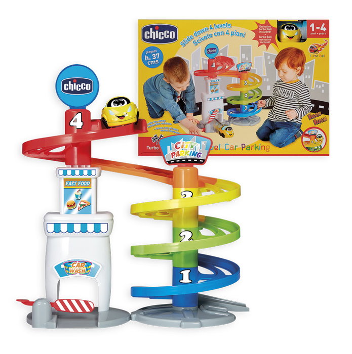El Parking Turbo Touch de Chicco es un conjunto de juegos donde todos los coches Turbo Balls pueden aparcar, restaurarse y prepararse para nuevas aventuras. Con 37 cm de altura, este parking cuenta con un tobogán de 4 niveles donde colocar a los coches y que rueden hacia abajo cada ve más deprisa. Este juguete es fácil de montar y desmontar cuando los niños terminen de jugar. Incluye un Turbo Ball amarillo.