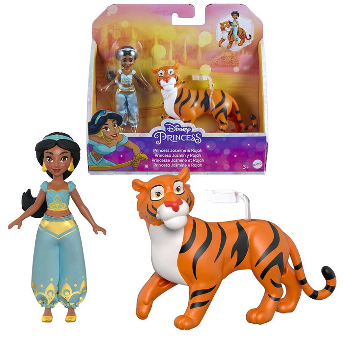 La muñeca Princesa Jasmine y la figura de Rajah, inspirados en la película de Disney, tienen un tamaño a pequeña escala adorable. La pequeña muñeca articulada Jasmine está más guapa que nunca con su look característico y viene con su cariñoso tigre y amigo Rajah. A los fans les encantará recrear sus escenas favoritas de Aladdín de Disney o inventar sus propias aventuras. La muñeca no puede tenerse en pie por sí sola. Los colores y la decoración pueden variar.