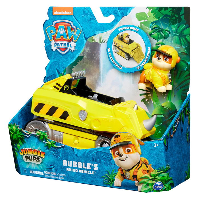 Pulsa la placa PAW para que la pala se mueva y se vea el cuerno de rinoceronte, a continuación, abre el compartimento trasero del vehículo y eleva el brazo de la grúa para usar la bola de demolición. Rubble mide más de 5 cm de alto y es igualito que en la serie PAW Patrol, con un casco y un uniforme para explorar la jungla de color amarillo. Los cachorros están que no paran en sus vehículos Jungle Pups. A sus fans les encantará dar rienda suelta a su imaginación y emprender emocionantes misiones de rescate con sus vehículos y sus cachorros preferidos.