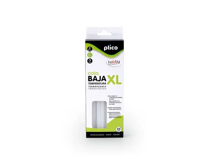 Cola termofusible Mini-XL Baja Temperatura de diámetro 8 mm x 200 mm. Ideal para pegar materiales delicados y evitar quemaduras en la escuela y el hogar.