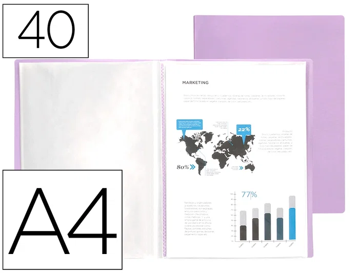 Fabricada en polipropileno. Portada flexible. Formato DIN A4. Colores opacos. Disponibles en 10, 20, 30, 40, 60 y 80 fundas. Portada 400 micras. Fundas 40 micras.