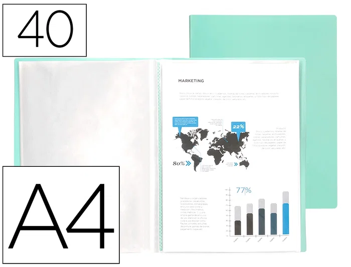 Fabricada en polipropileno. Portada flexible. Formato DIN A4. Colores opacos. Disponibles en 10, 20, 30, 40, 60 y 80 fundas. Portada 400 micras. Fundas 40 micras.