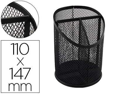 Cubilete redondo de metal de rejilla con 3 compartimentos para clasificar bolígrafos, rotuladores o lápices. Medidas: Ø110 x 147 mm. No incluye accesorios.