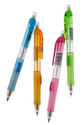 Portaminas con ancho de trazo de 0,5 mm, Su cuerpo de plástico (PS)transparente combina con los alegres colores que lleva en el clip, grip y en el pulsador lateral, además, tiene una goma de borrar incluida en la parte superior, cubierta con un tapón transparente, y viene con 2 minas HB para que puedas utilizarlo desde el primer día de clase.
