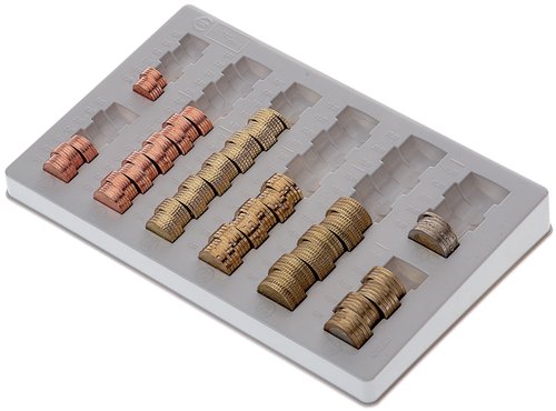 Bandejas clasificadoras para monedas de euro en plástico inyectado de gran resistencia, diseñadas para evitar errores en cambio o recuento. Tiene 6 columnas y cada una está ligeramente descentrada y subdividida de 5 en 5, con el valor nominal de cada moneda grabado en relieve de forma legible y duradera. Tamaño: 165 x 270 x 30 mm.