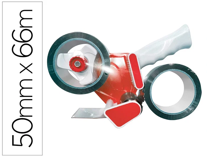 Dispensador para cinta de embalaje de 50 mm de ancho, con mango rígido. Ideal para un uso continuado. Incluye dos rollos de cinta adhesiva de color marrón de 66 m x 50 mm.