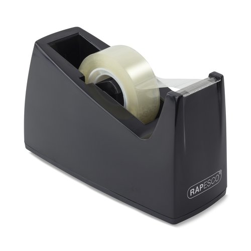 Dispensador de cinta, en color negro, con base de goma antideslizante que ofrece estabilidad. Utiliza carretes de cinta estándar 33 m x (19 mm o 25 mm de ancho) (cinta no incluida). 3 años de garantía.