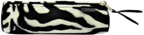 Portatodo redondo con cremallera realizado en tela de pelo sintético suave, que imita el pelaje de una cebra.