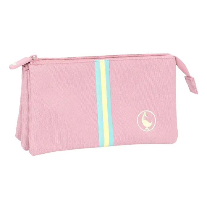 El Portatodo de la marca Safta es un accesorio práctico y funcional diseñado para organizar utensilios escolares o de oficina, destacando por su formato compacto y versátil. Este modelo corresponde a un portatodo triple, que permite distribuir el contenido en tres compartimentos separados, facilitando la organización y acceso rápido a bolígrafos, lápices, rotuladores u otros elementos pequeños. Presenta unas medidas aproximadas de 22 x 12 x 3 cm, un tamaño que combina buena capacidad sin resultar voluminoso, ideal para llevar en mochilas o bolsos sin ocupar demasiado espacio. Su diseño, identificado bajo el nombre "El Ganso Basics Pink", ofrece una estética sencilla pero funcional, con un color rosa que puede resultar atractivo para estudiantes o personas que prefieran tonos suaves y discretos. La estructura robusta del portatodo garantiza resistencia al uso diario, mientras que el cierre ajustado mantiene los objetos protegidos y en su lugar. Este modelo es idóneo para quienes buscan un organizador compacto con múltiples compartimentos, que aporte orden y accesibilidad a todos sus útiles sin complicaciones de espacio. En resumen, el Portatodo Triple Safta "El Ganso Basics Pink" es una solución eficiente y de tamaño manejable para quienes necesitan mantener su material ordenado y al alcance con un diseño sencillo y moderno.