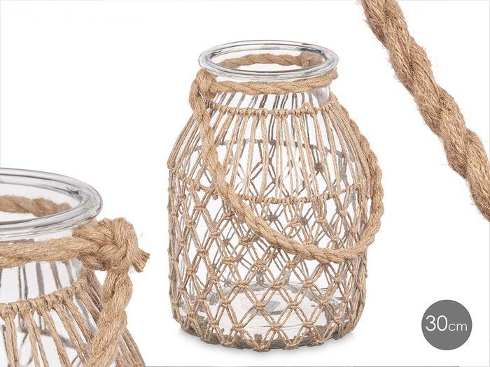 Giftdecor Portavela Vidrio Cuerda Natural Transparente 20 cm x 30 cm x 20 cm (Set de 4)