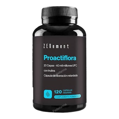 Indicaciones: Proactiflora es una mezcla bacteriana exclusiva de alta potencia con función probiótica y prebiótica (30 mil millones de UFC) con la composición de cepas más completa: 19 cepas (5 cepas de bifidobacterium + 12 cepas de Lactobacillus + Enterococcus faecium + Lactococcus lactis), que actúan en simbiosis con los Prebióticos de Inulina, para ayudar a un normal mantenimiento intestinal. Se presenta en cápsulas gastrorresistentes (Liberación retardada): Las bacterias son muy sensibles a la acidez del estómago, por este motivo, estas cápsulas han sido formuladas con un revestimiento entérico que permite asegurar la completa liberación de microorganismos y mircrobiota en nuestro intestino. Producto vegano sin gluten, lactosa, ni conservantes.