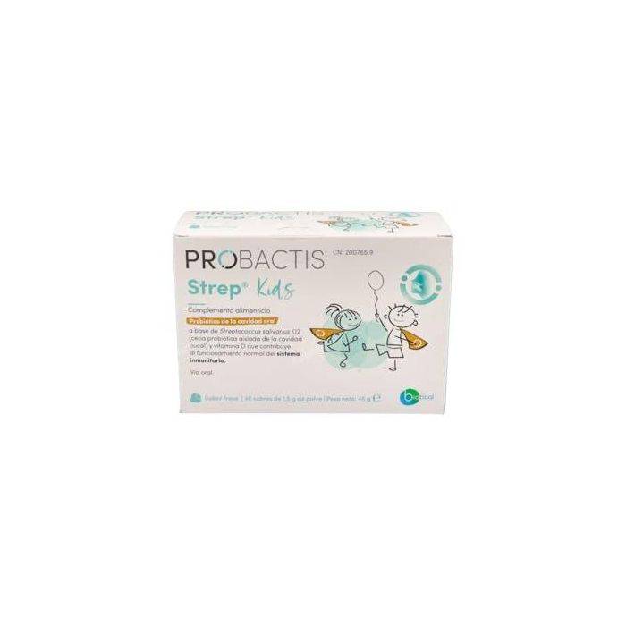 Probactis Strep Kids Fresa Complemento Alimenticio con Streptococcus Salivarius K12 y Vitamina D3 para el Sistema Inmunitario Infantil 30 Sobres