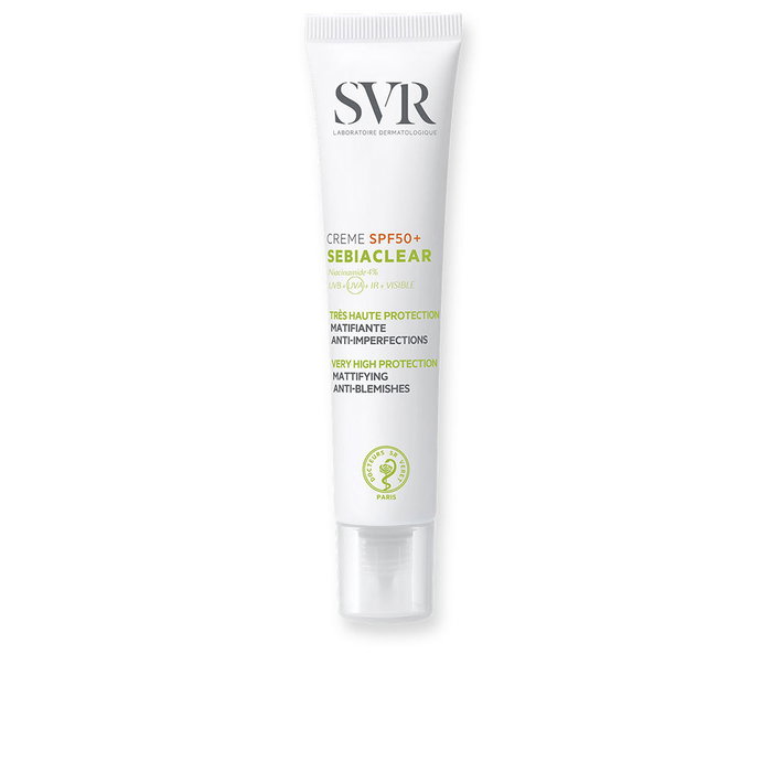 SEBIACLEAR crema SPF50 de SVR LABORATOIRE DERMATOLOGIQUE es un protector solar facial de muy alta protección, diseñado específicamente como cuidado matificante para pieles grasas con tendencia al acné.