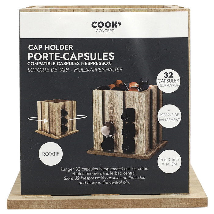 - Original dispensador de cápsulas en forma de cubo con capacidad de 32 cápsulas tipo Nespresso en los laterales y más en la parte interior del cubo.
