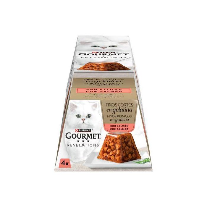 Gourmet Revelations Mousse con salmón es un increíble pack de 4 pirámides de comida húmeda, en forma de pastel y con una irresistible cascada de salsa para gatos adulto. Un nuevo formato que ofrece una experiencia culinaria única a los felinos más exigentes, para aquellos que disfrutan de la variedad de texturas, formas y sabores.
