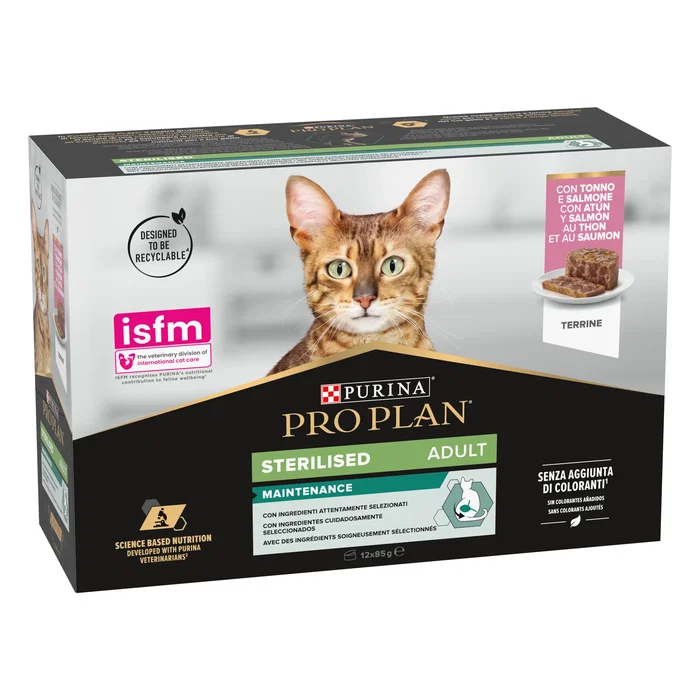 Purina Multi Lata Alimento Húmedo para Gatos Adultos Esterilizados, Salmón y Atún, 12x85 gr