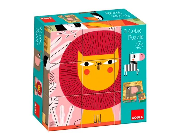 Puzle cúbico formado por 9 cubos ilustrados con animales de la selva con 6ilustraciones diferentes: león, cebra, leopardo, elefante, tucán y mono. El color del fondo de la ilustración ayudará a los niños a formar el puzlecorrectamente. En el dorso de la caja encontraremos una guía con las ilus traciones para facilitar la construcción del puzle a los niños/as.