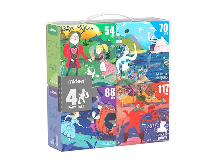 Este set de 4 puzzles, para niños de 4 años en adelante, contiene cuatro rompecabezas progresivos bellamente ilustrados de menos a más piezas, 54, 70, 88 y 117 piezas. De fácil a más difícil, lo que ayuda a promover la coordinación mano-ojo y las habilidades de observación. Estos puzzles temáticos de Cuentos, permiten a los niños aprender más sobre diferentes historias, mientras juegan. Incluye una guía ilustrada de cada puzzle.