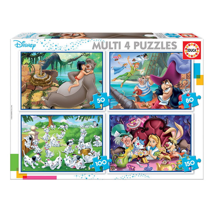 Educa Puzzle Multi 4 Clásicos Disney 18105 Puzzles Progresivos 12-16-20-25 Piezas Libro Selva Peter Pan 101 Dalmatas Alicia +3 Años