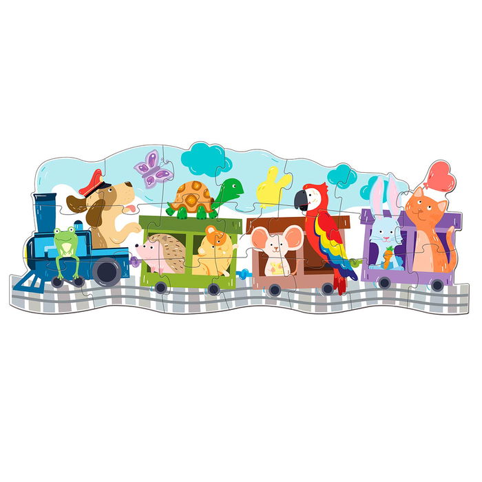 La estación de tren está muy ocupada con todos los animales preparándose para irse de vacaciones. Monta el puzle y lee la divertida historia. ¡Lleva el estuche contigo en tus propias aventuras! Medidas puzle: 350 x 900 mm.