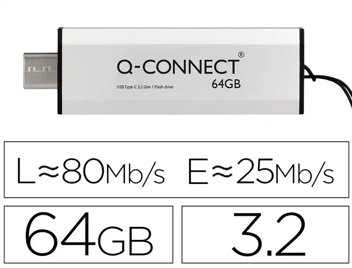 La memoria Q-Connect USB flash drive de 64GB con conexión USB 3.2 Gen 1 tipo C. Ofrece velocidades de lectura de hasta 80MB/seg y de escritura de hasta 25MB/seg. Compatible con Windows y Mac, este dispositivo cuenta con uncuerpo deslizante que protege el conector cuando no está en uso. Su diseñ o plateado y la compatibilidad con versiones anteriores de USB 2.0 lo hacen versátil y práctico. Además, cumple con normativas y certificaciones como CE, UKCA y WEEE.