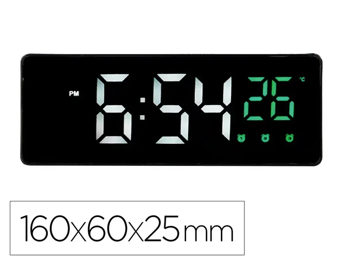 La colección de relojes digitales Q-Connect ofrece una perfecta combinación entre un diseño moderno y funcionalidad, perfectos para oficina, dormitorios o salas de estudio. Este modelo incluye 3 alarmas, vibración, formato12/24 h y medición de temperatura en °C/°F. Su activación por sonido (pal mada o ruido) ilumina la pantalla para una lectura rápida en cualquier momento. Dispone de LED verde y blanca, funciona conectado a la corriente mediante cable USB incluido y puede guardar la hora con 3 pilas AAA (no incluidas), aunque no funciona solo con pilas. Medidas: 160 x 60 x 25 mm.