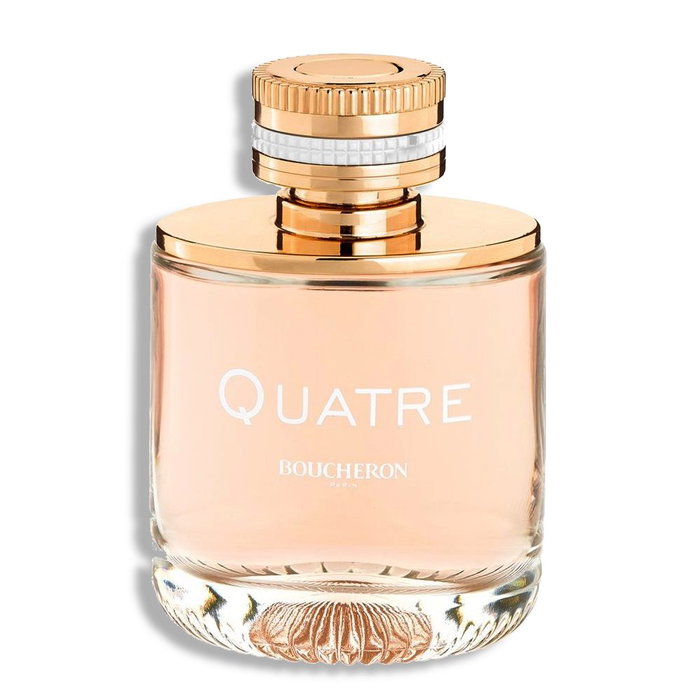 Boucheron quatre de boucheron es una fragancia de la familia olfativa floral frutal para mujeres. esta fragrancia es nueva. boucheron quatre se lanzó en 2015. boucheron quatre fue creada por nathalie gracia-cetto, nadege le garlantezec y antoine maisondieu. las notas de salida son toronja (pomelo), limón (lima ácida), naranja y naranja tangerina. las notas de corazón son manzana, jazmín, durazno (melocotón), rosa y fresa. las notas de fondo son caramelo, cachemira, vainilla, almizcle blanco y cedro.