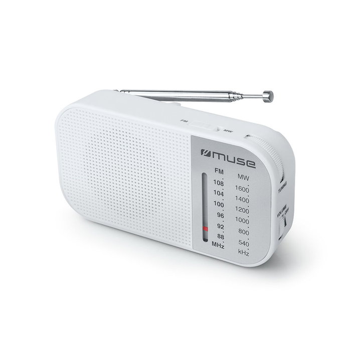 Muse M-025 RW. Tipo de radio: Portátil, Tipo de sintonizador: Analógica, Bandas de radio soportadas: FM, MW. Color del producto: Blanco, Control de volumen: Giratorio, Tipo de antena: Externo. Tecnología de batería: Alcalino, Tamaño de baterías compatibles: AAA, Tipo de batería: AAA. Fuente de energía: Batería. Ancho: 32 mm, Profundidad: 130 mm, Altura: 70 mm