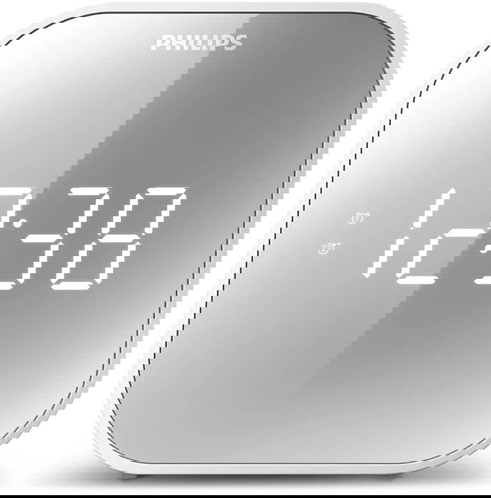 Reloj despertador Philips con radio FM/AM, pantalla espejo y función de carga USB. Cuenta con alarma dual programable. Ideal para uso doméstico u oficina.