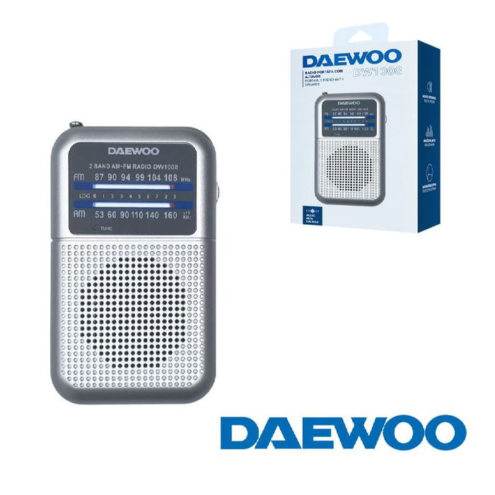 Radio Daewoo con sintonizador AM y FM en elegante color plateado. Equipo de audio portátil que te permite disfrutar de emisoras de radio en AM y FM. Fabricado por la reconocida marca Daewoo, este radio combina un diseño clásico con funcionalidades esenciales. Ideal para llevar contigo a cualquier lugar y mantenerte informado y entretenido con tu música y programas favoritos.