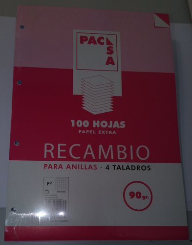 Papel blanco Extra de 90 gr/m² con 4 taladros, rayado y margen en color. Se presenta en paquete retractilado con carátula de cartón de 225 gr/m², impreso a dos colores.